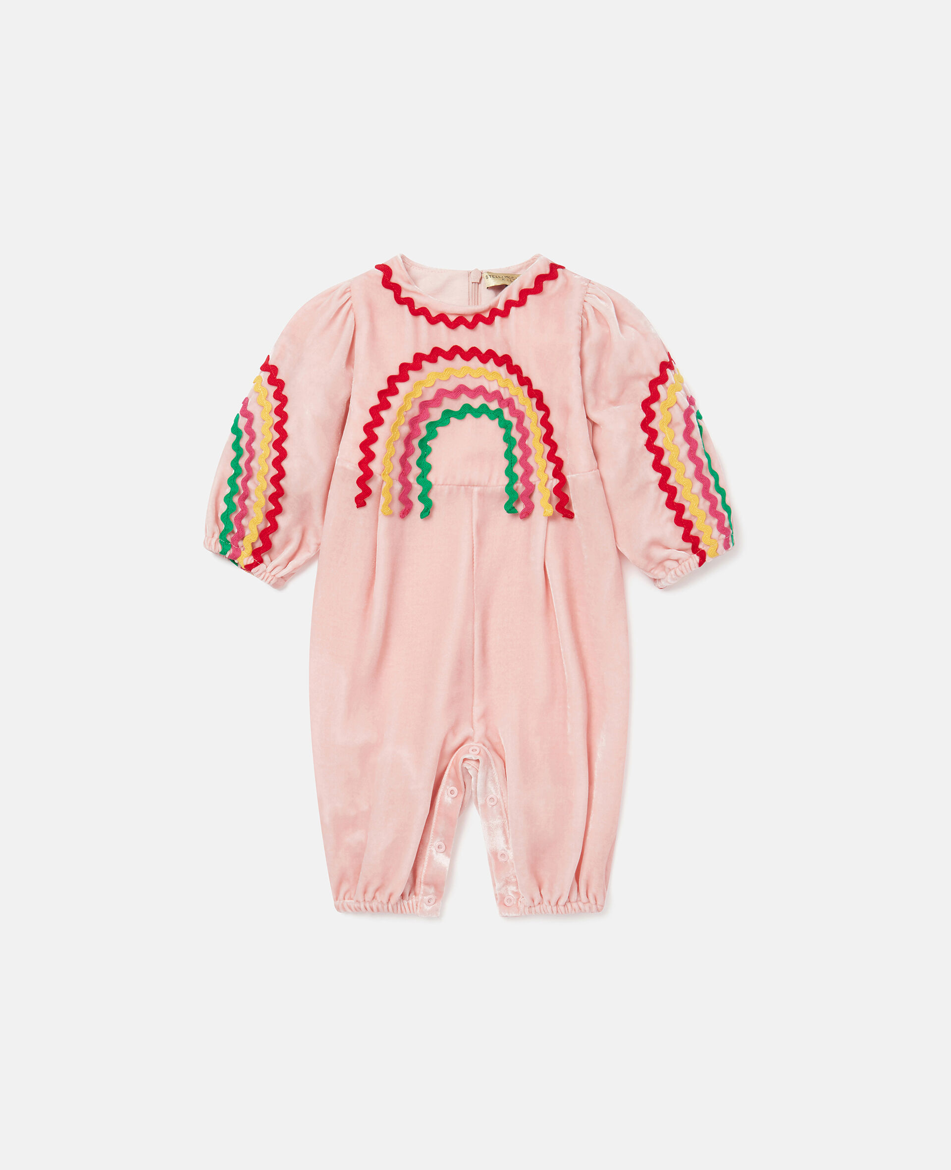 - Rainbow arch ric-rac ribbons in red, metallic gold, hot pink and bright aqua at front and sleeves