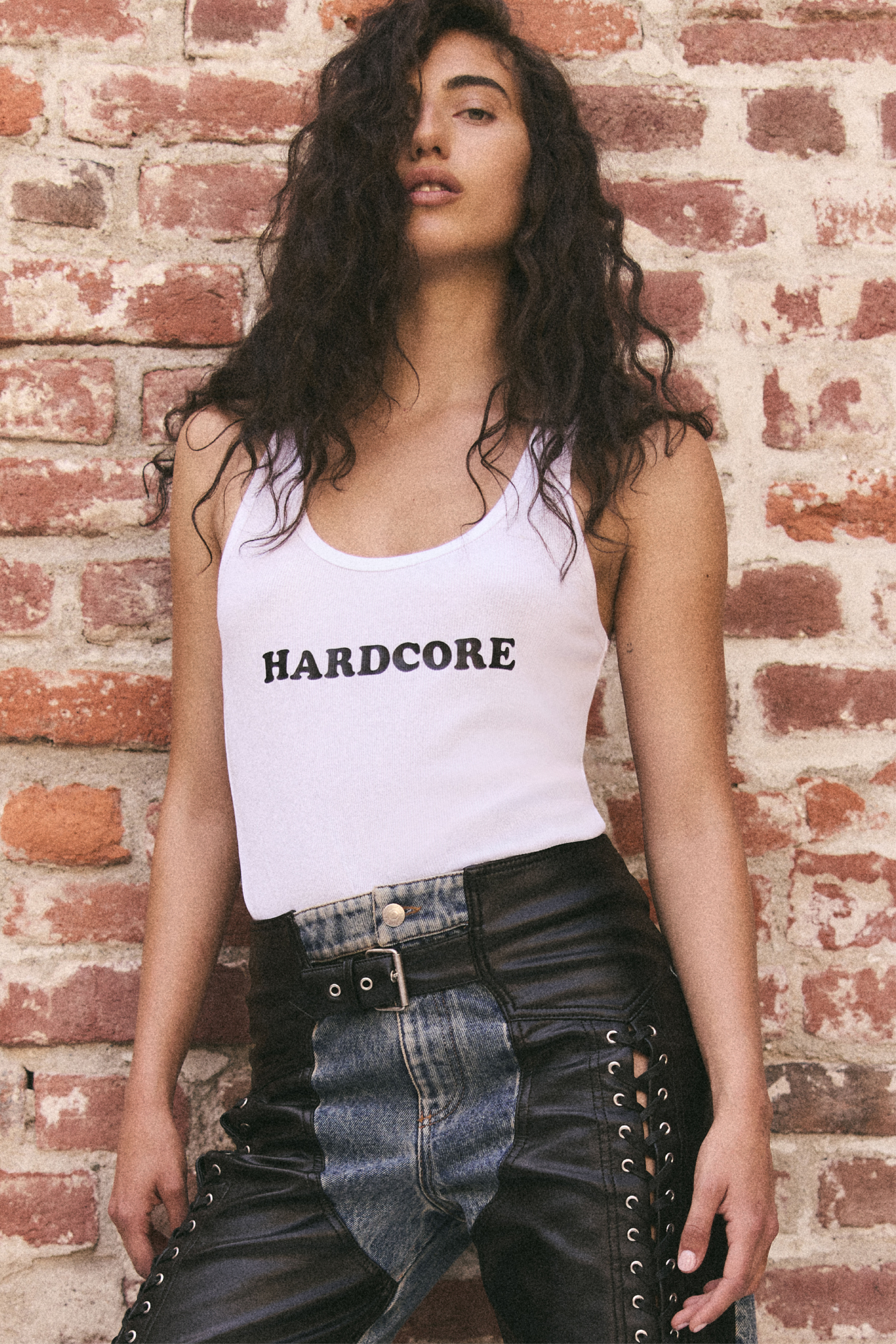 Stella’s music heritage is felt in the rock ‘n’ roll attitude of tank tops with algae-based pigment lettering, and whipstitched wide organic cotton jeans, iconic chaps and denim featuring contrasting black equestrian leg panels. Blazers, outerwear and knit rugby polos are in a clouded leopard jacquard, while classic men’s shearling aviator jackets and culottes are in vegan alternatives to leather made using recycled materials.