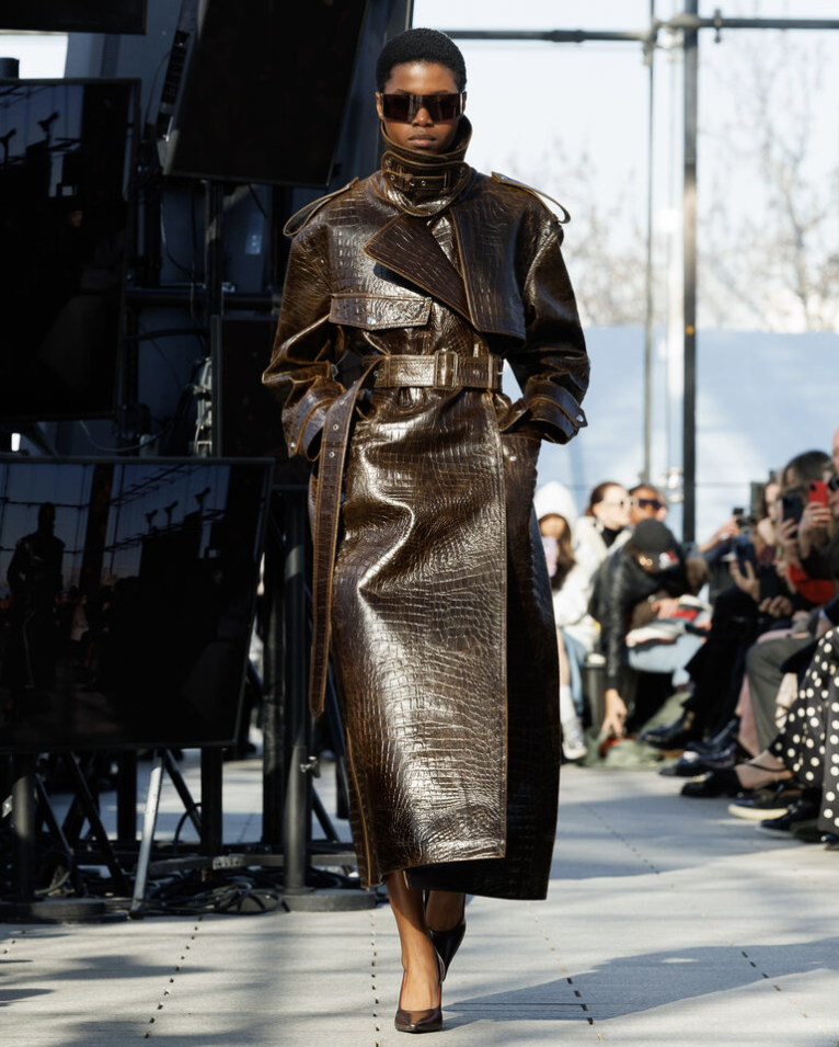 The S-Wave bag was introduced as part of the Winter 2022 collection, named for its statement brand-mark moulded from zero-waste zamac. Appearing as a baguette shoulder bag and wallet clutch in chocolate brown and black for Winter 2023, the accessories feature webbing straps and a monogrammed lining made from 100% post-consumer recycled polyester. Their trims are also in UPPEAL™, without the crocodile embossing.