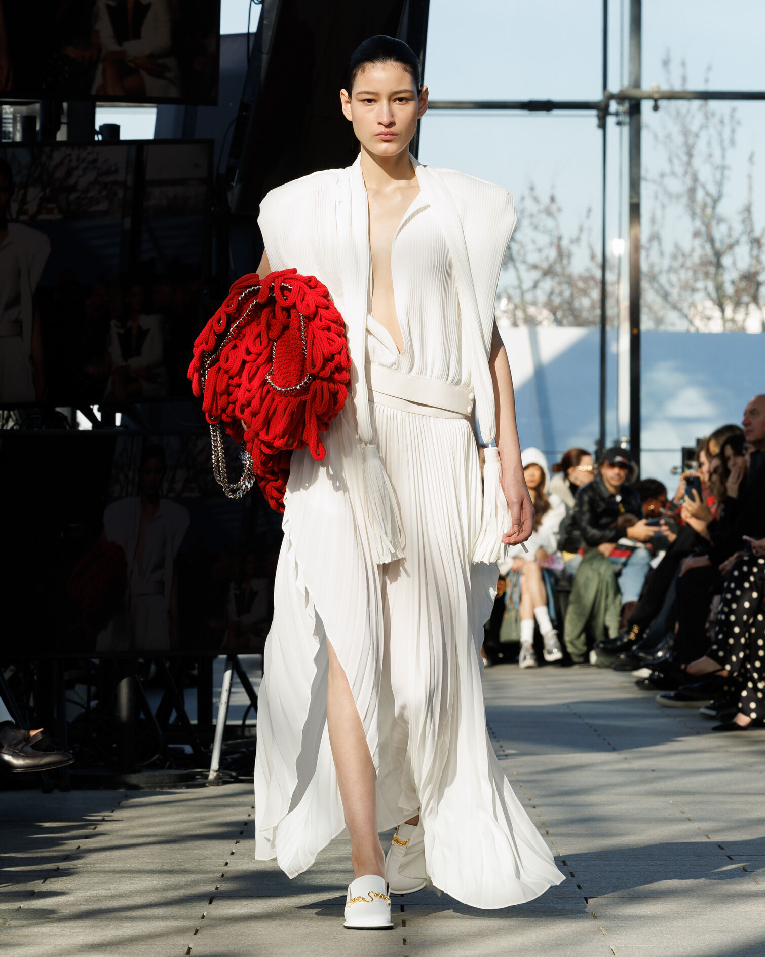 This season introduced ready to wear in YATAY B – a biobased alternative to animal leather that blends agricultural waste and recycled materials together, creating crackled, cruelty-free white skirts and trench coats belted at the waist. A spongy, vegan leather alternative takes the form of volume biker jackets, hand-treated to create a vintage feel.