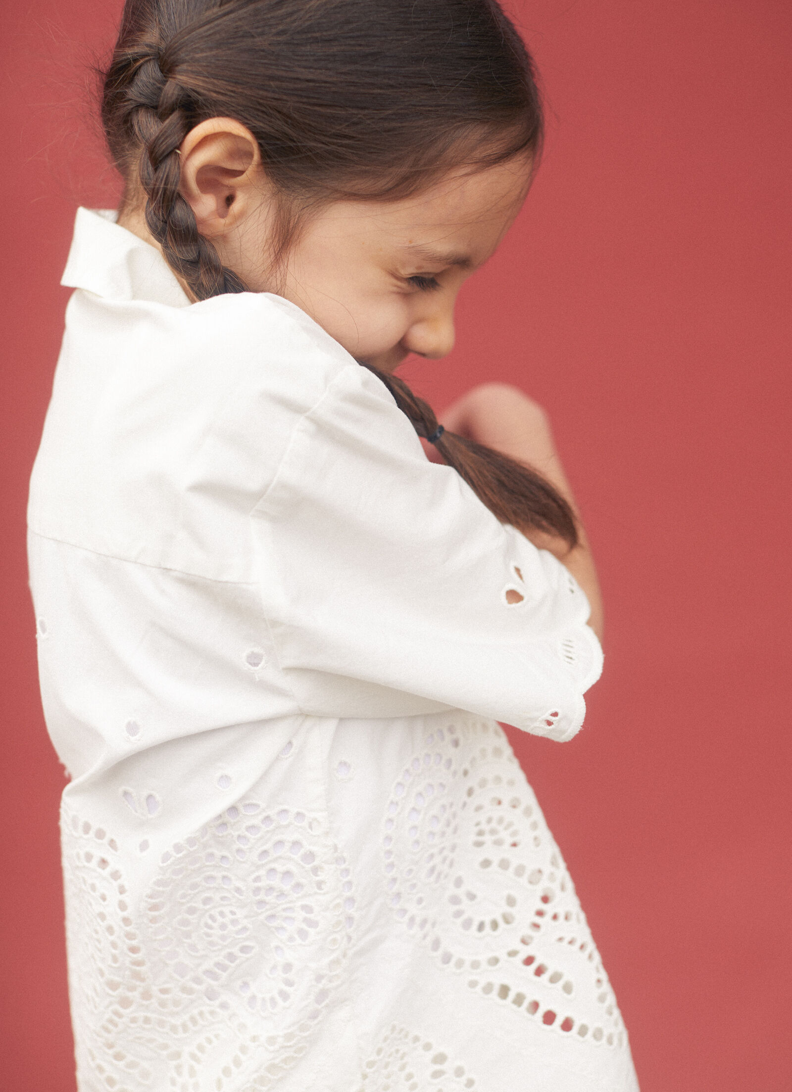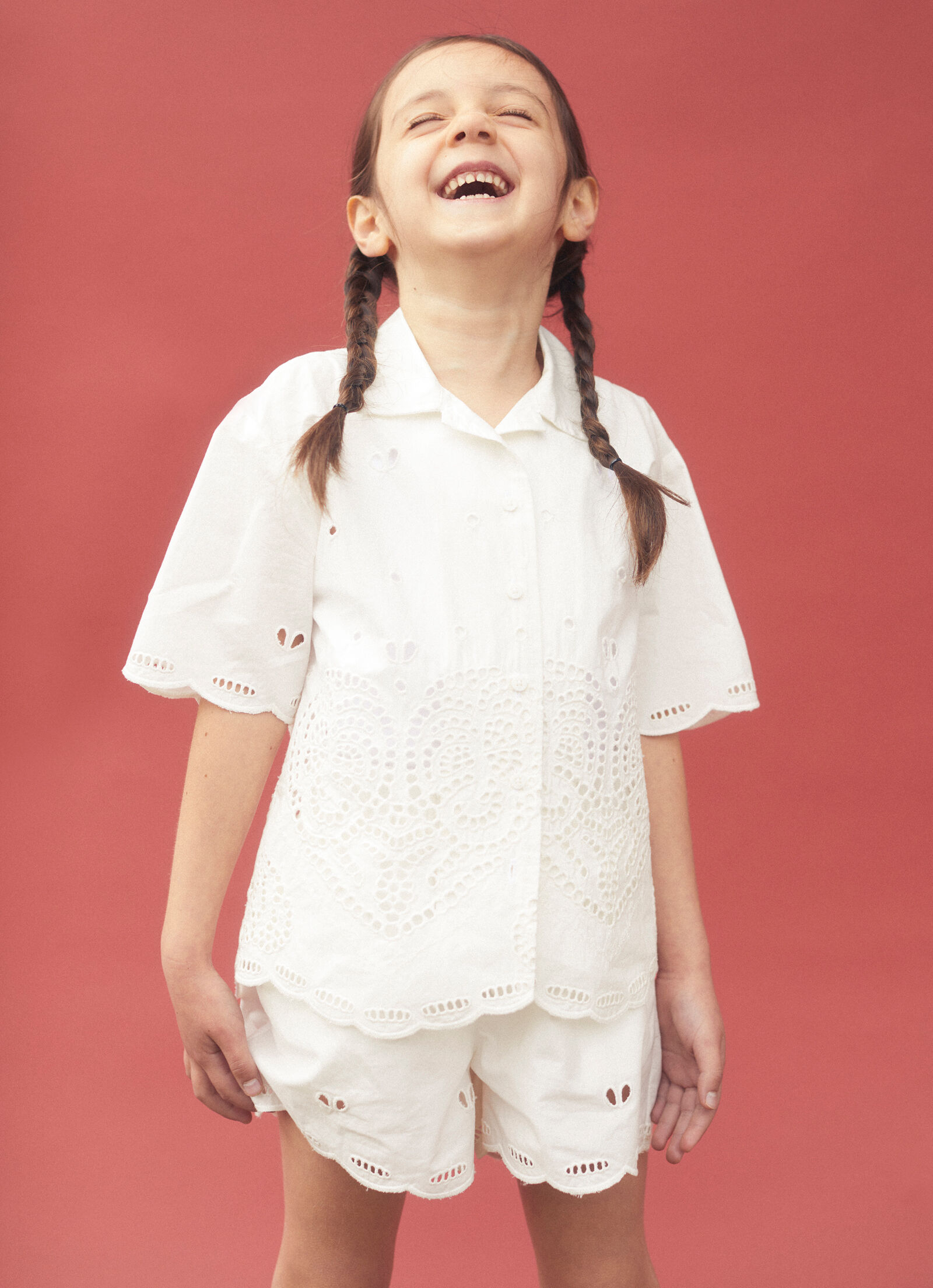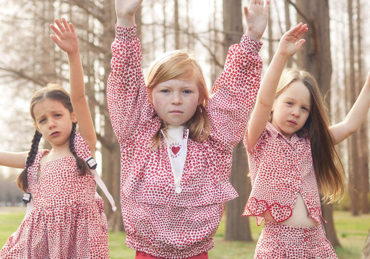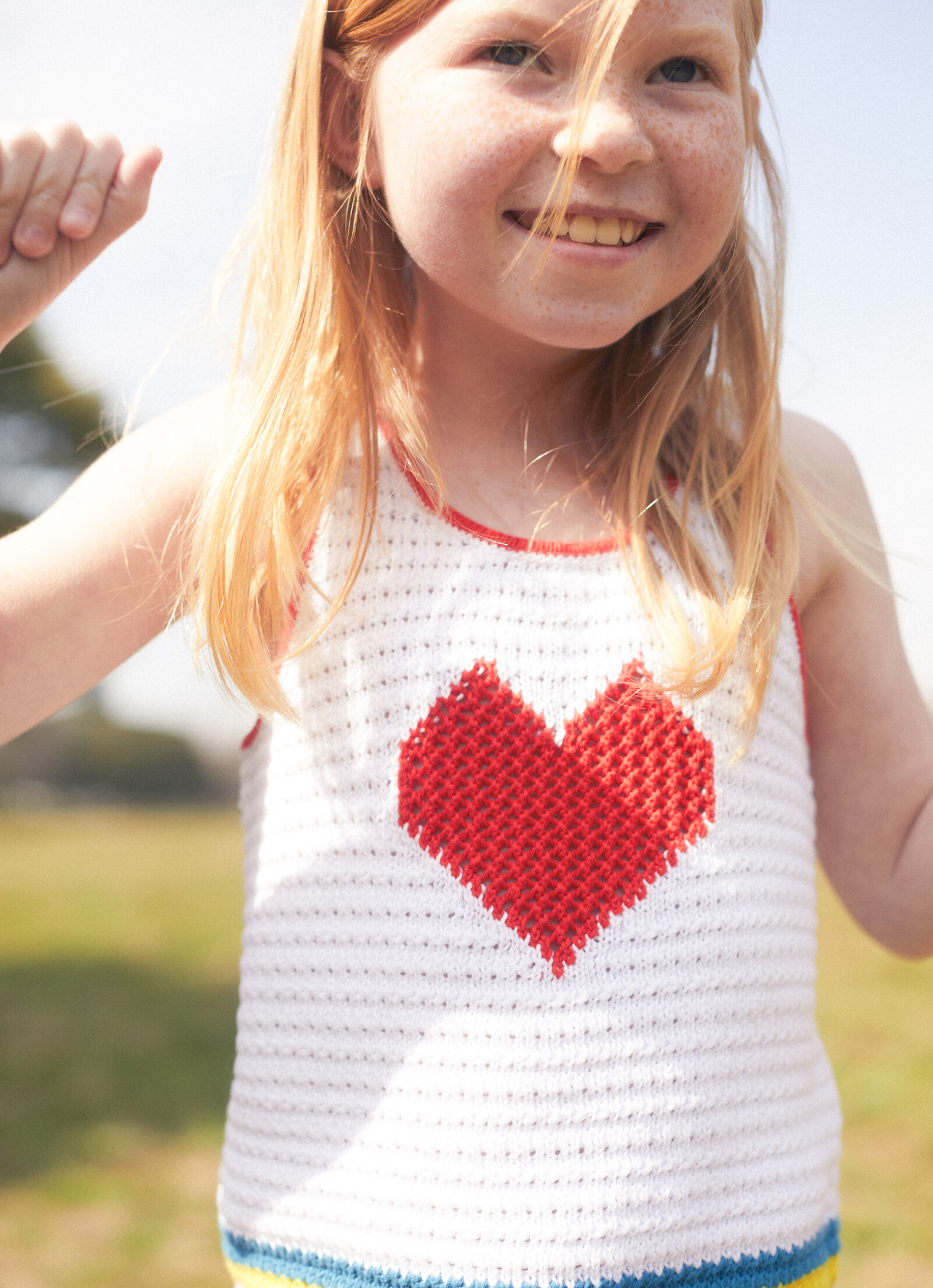 Pulling from a nostalgia for summers past and the joy of warm-weather family holidays, red heart prints are inspired by a beach dress Stella wore as a child – lovingly scattered across a story of cotton voile separates and buttery soft swimwear in recycled materials. Crochet separates are knitted in a soft organic cotton weave, all printed with bold red hearts. These are mirrored in our women’s ready-to-wear offering, for complete ‘mini me’ coordination.