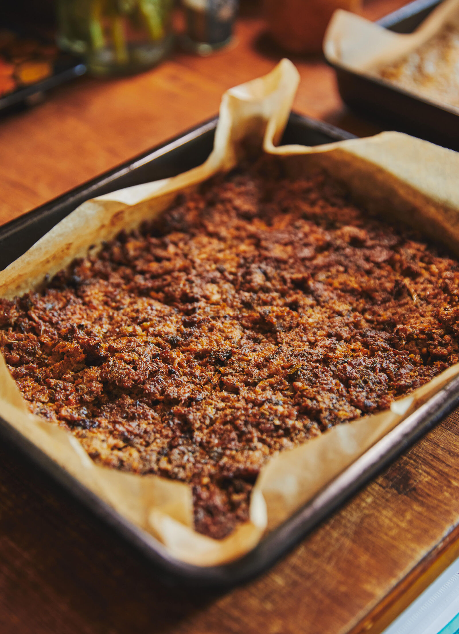 8,クッキングシートを敷いたトレイにボウルの中身を広げ、まんべんなく火が通るように平らにのばし、220度オーブンで30分加熱する。(家庭のオーブンにより時間は調整、表面がこんがりと焦げるまで焼くのがベスト)