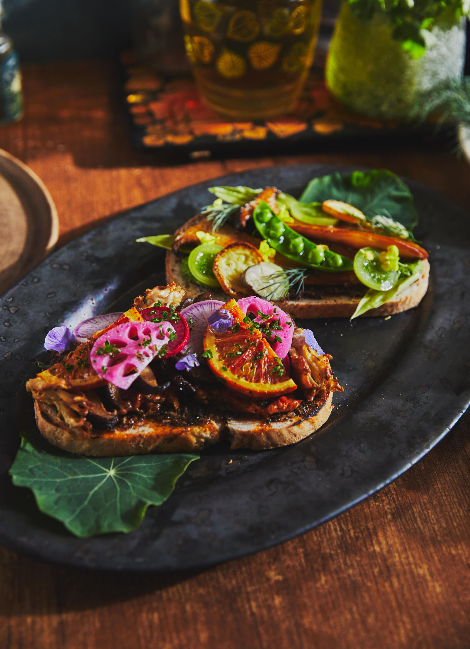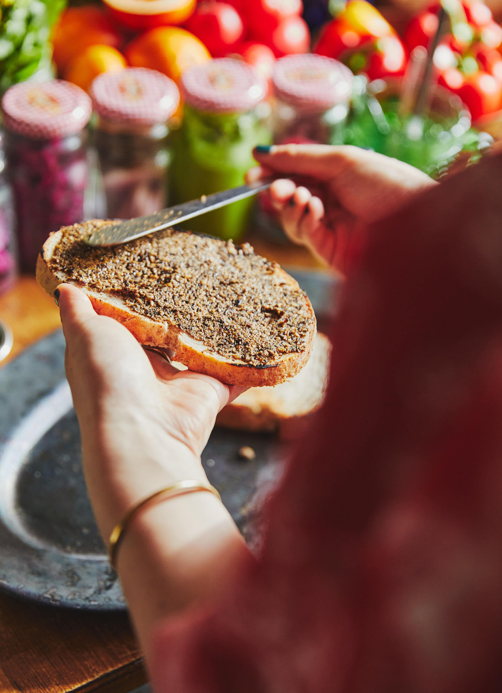 11,最後の盛り付けは焼き上がったパンにパテをたっぷり塗り、お好みでフレッシュな野菜、フルーツ、グリル野菜などをのせる。マッシュルームパテがダークカラーなので、彩の良いビビットな野菜をのせるとより美しくコントラストのあるタルティーヌに