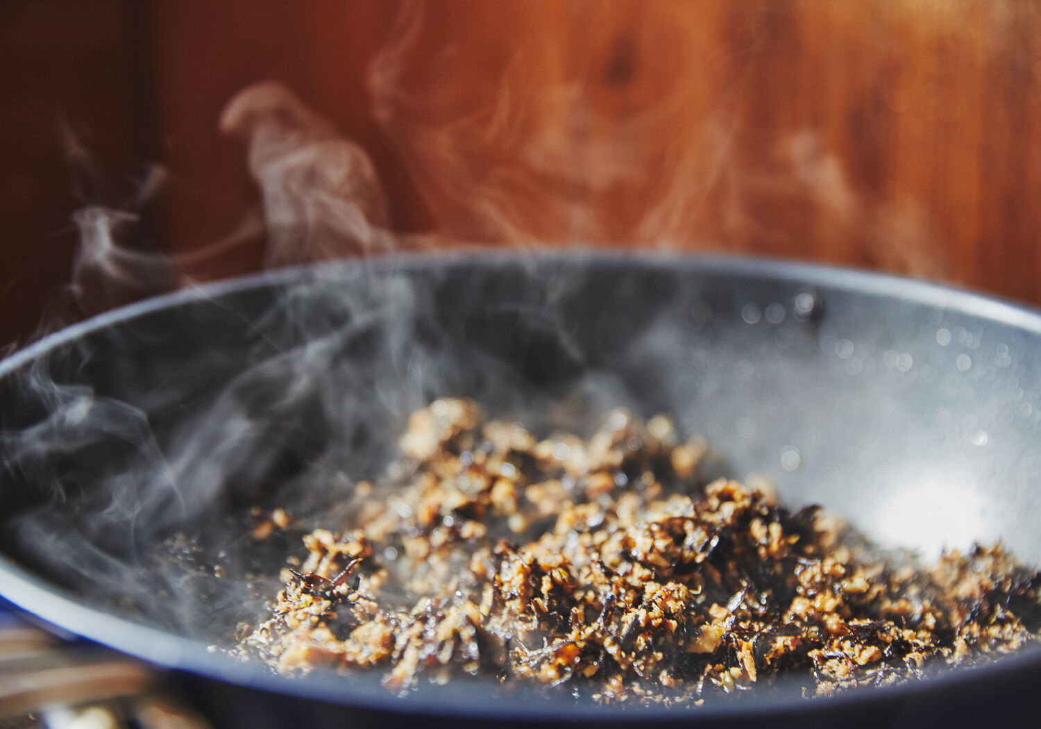 5,しっかりと混ぜ合わせたら、極弱火にし、焦げないくらいの火力でそのまましばらく火にかけて水分を飛ばす。(ひじきの磯の香りが強いのでここでしっかりと水分を飛ばすこと)