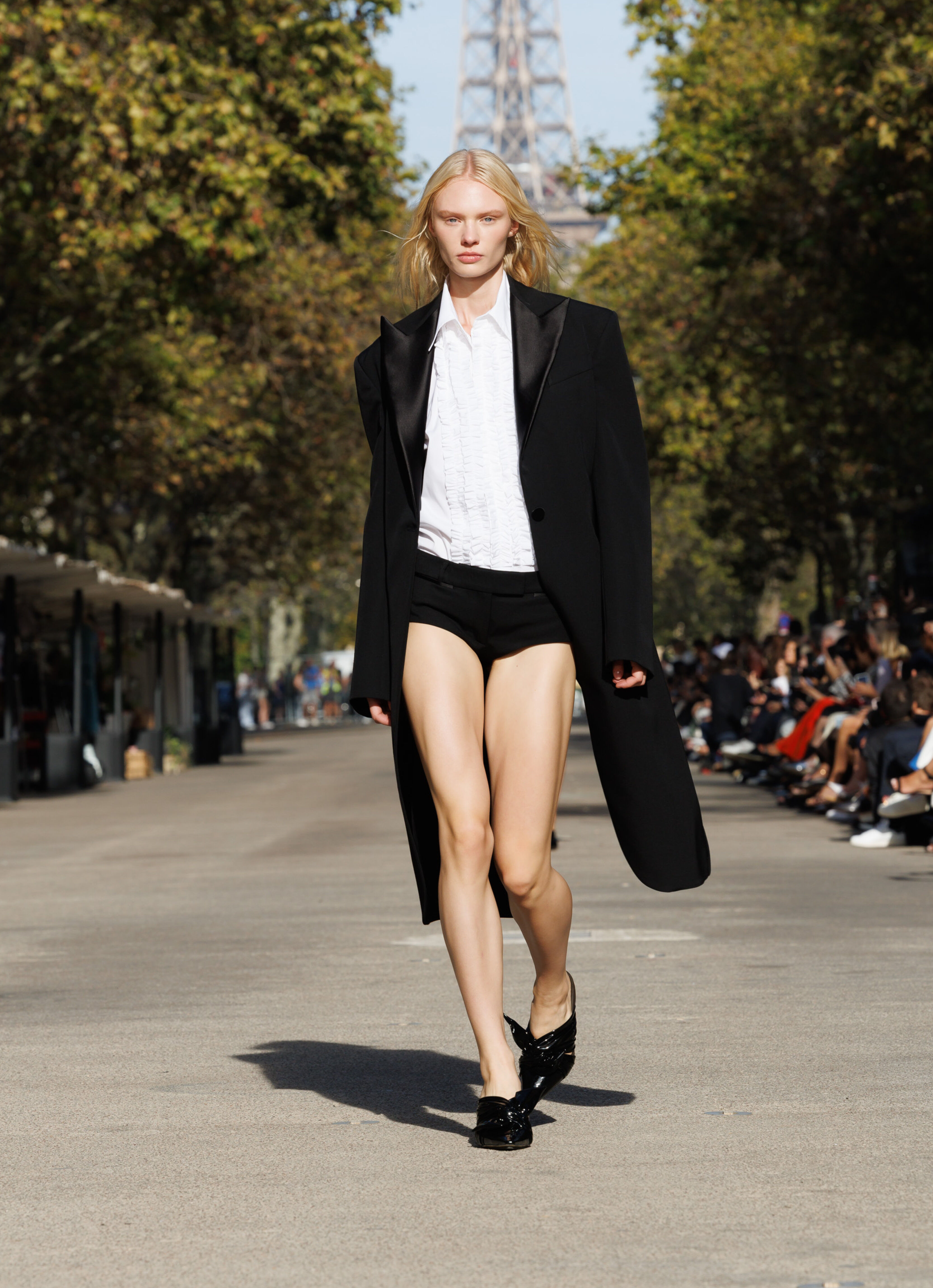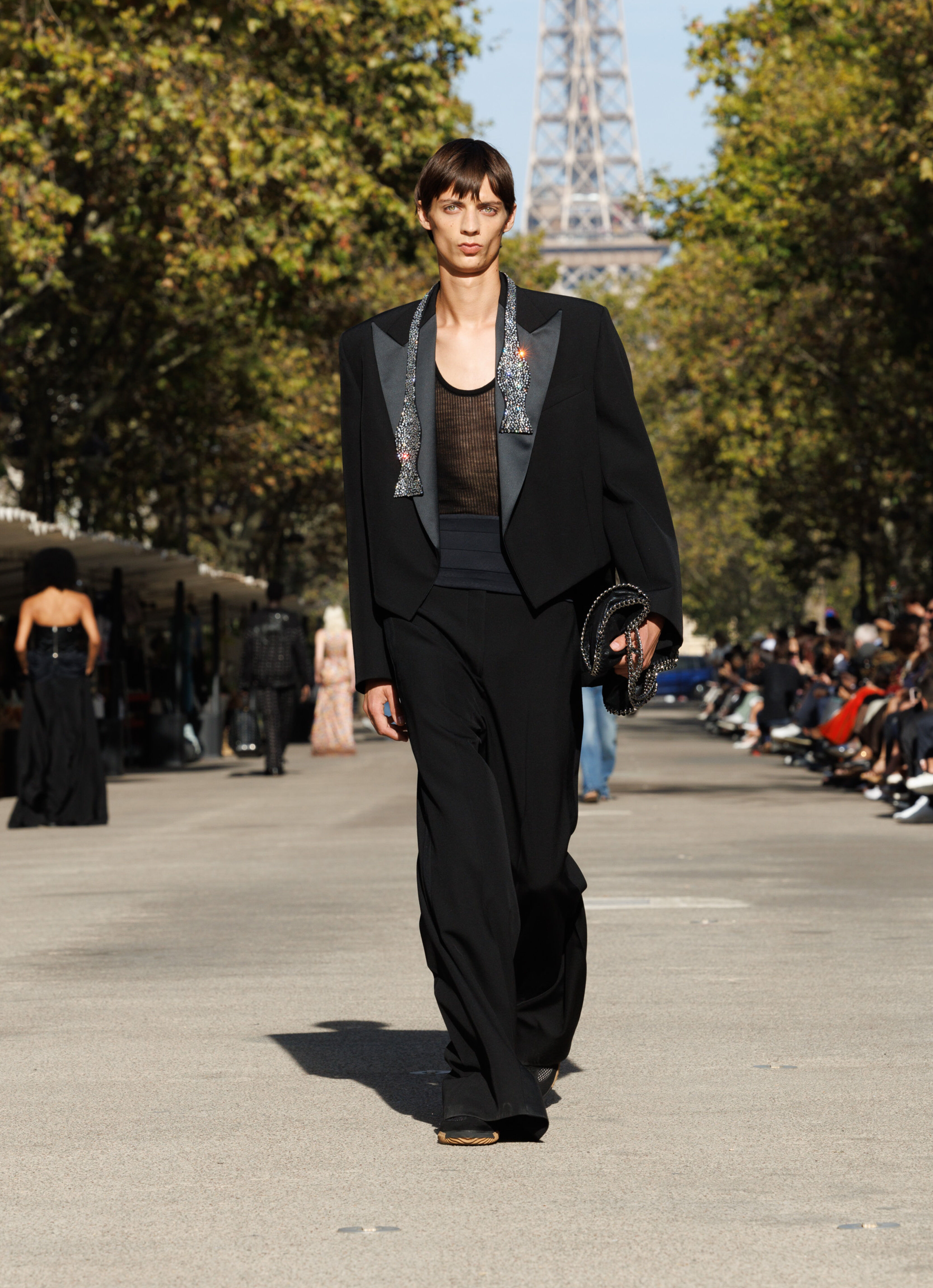 ステージルックは、ブラックにクリスタルをちりばめたウエストコートに、ラッフル付きのシャツをスタイリングするなど、メタリックなブロケード生地のテーラリングとして再解釈されています。ラグジュアリーブランドとして世界で初めて海藻由来の繊維である「Kelsun™」を使用したエクリュカラーのニットドレスには、ミラー仕上げのポルカドットがクロシェ編みで施されています。