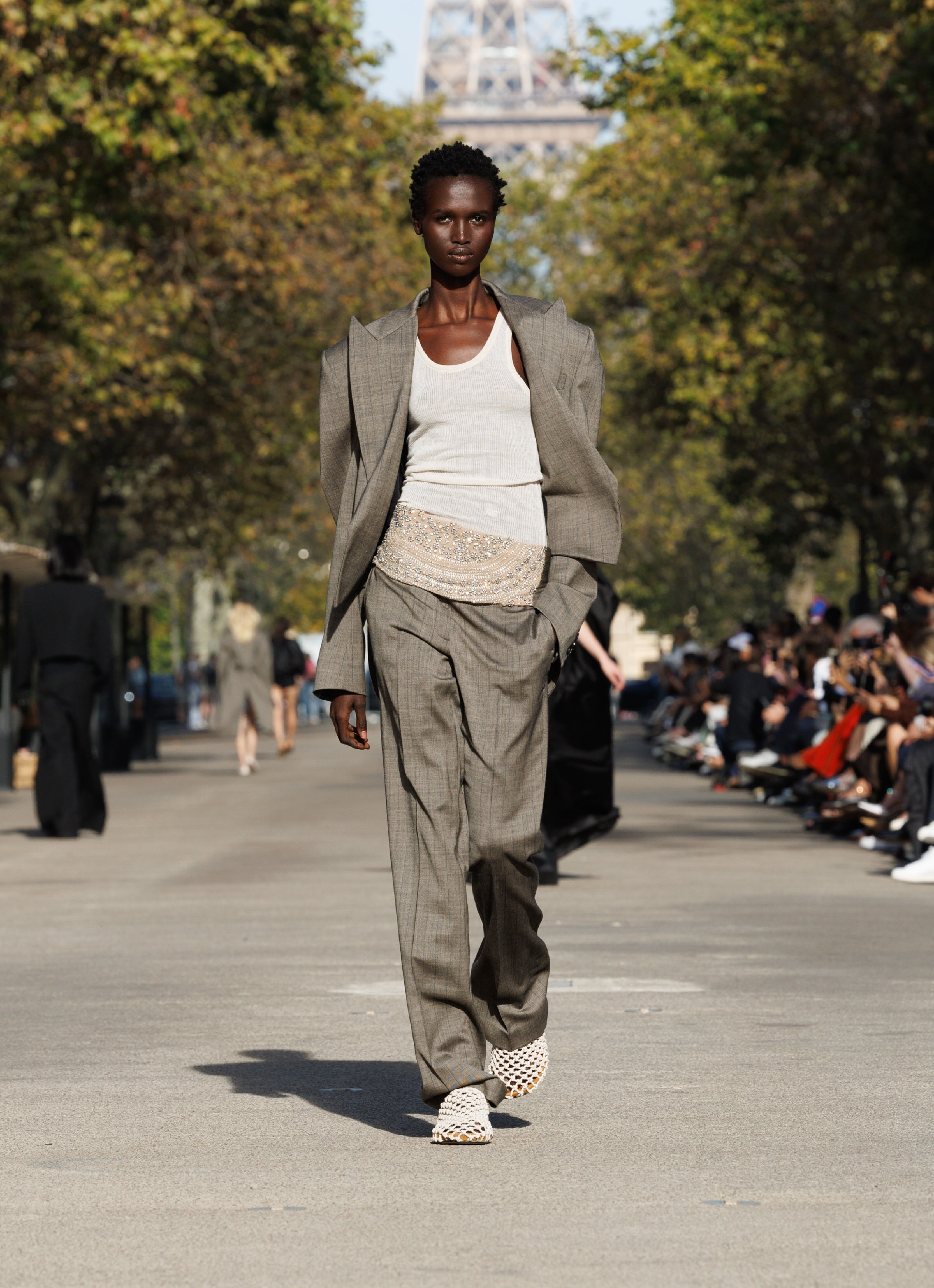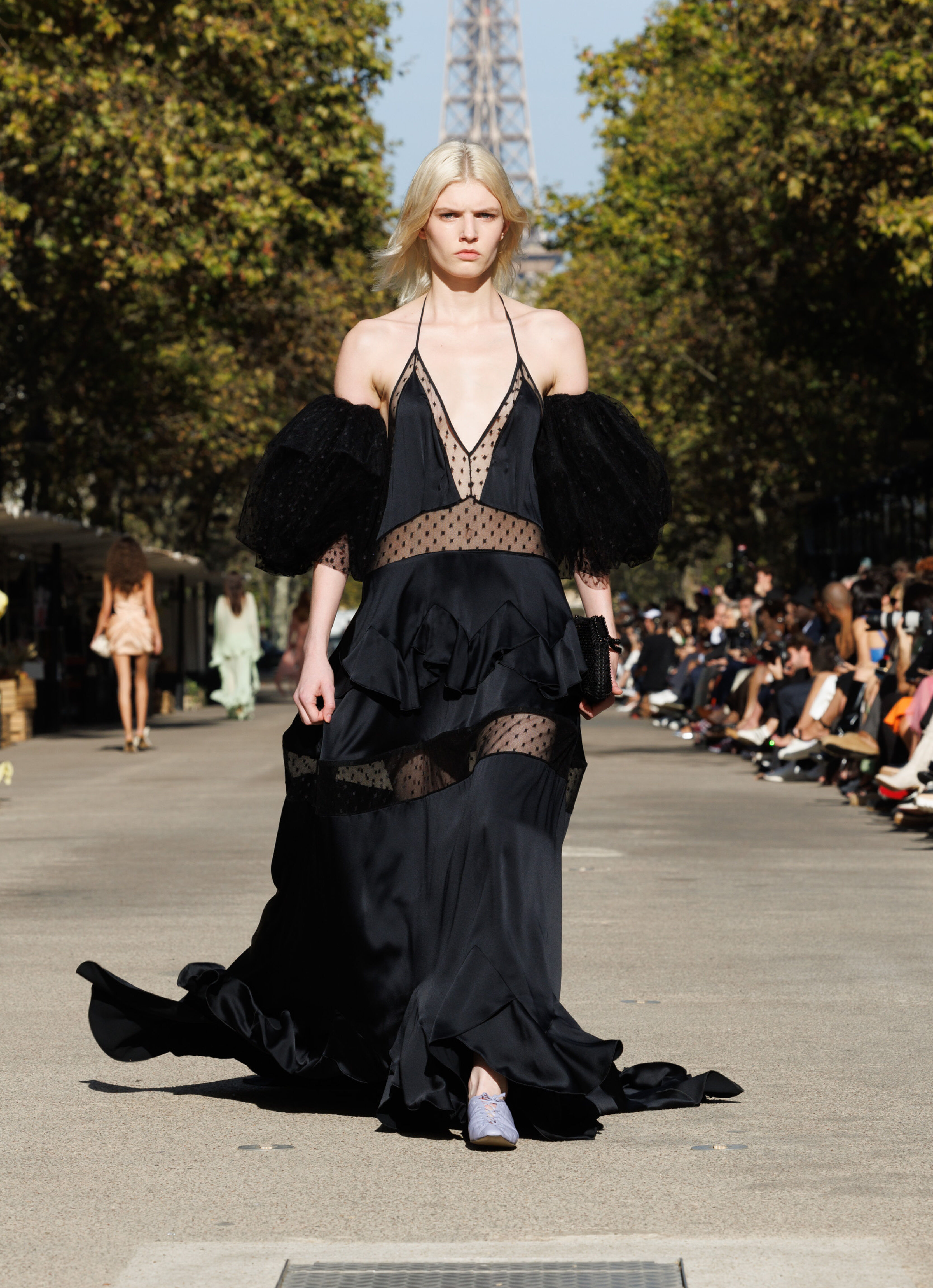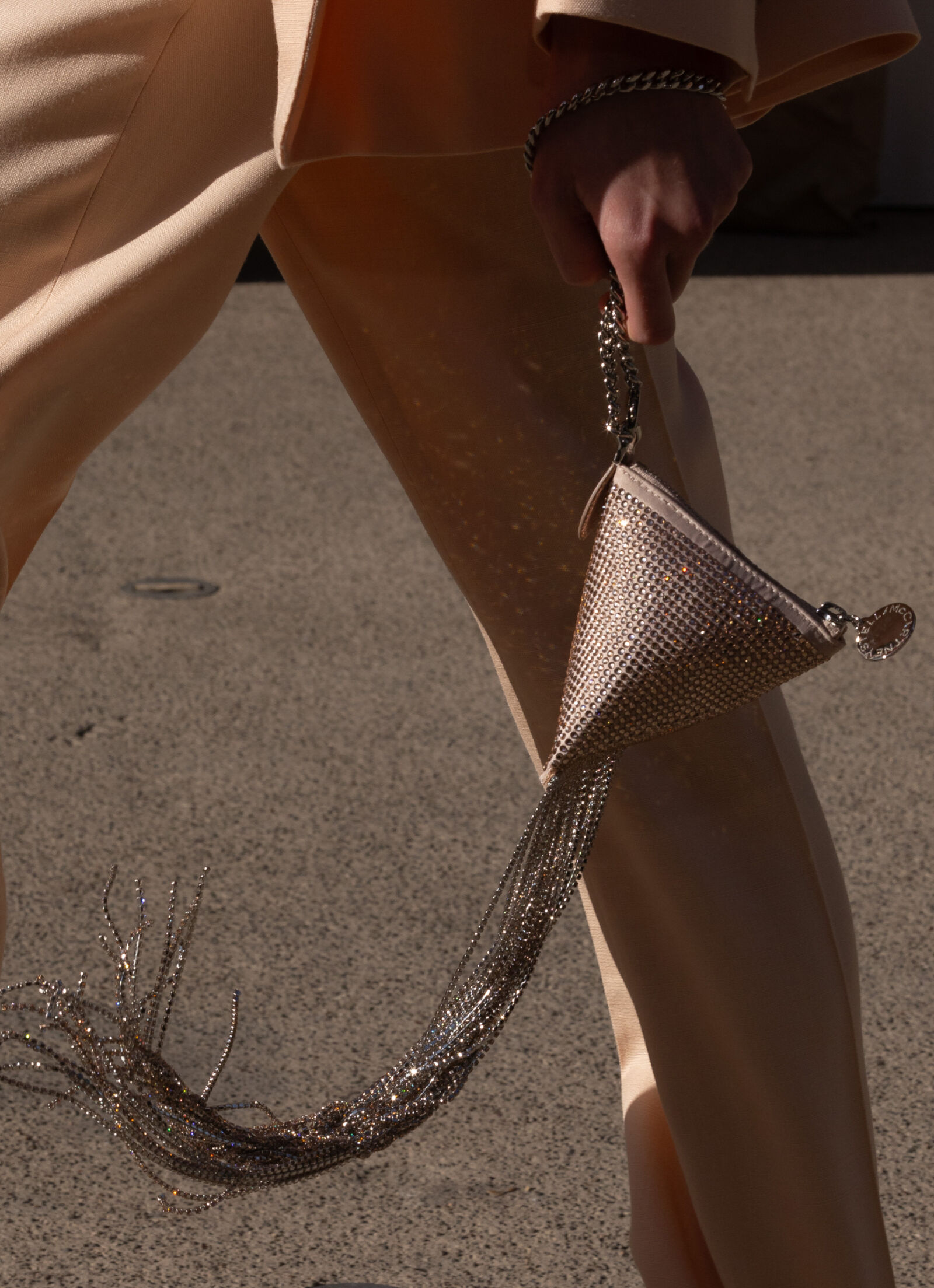 ランウェイショーでは、完全にトレーサブルな再生農法でブドウを栽培している、ヴーヴ・クリコ(Veuve Clicquot)のシャンパーニュのために収穫されたブドウの搾りかすから作られた、動物皮革に代わるヴィーガンレザーを使用した「フレイム(Frayme)」バッグも、レースと結び目をアクセントに登場。アイコニックな「ファラベラ(Falabella)」バッグは、ひねりを効かせたトライアングルシルエットにクリスタルをちりばめたスタイルで、「ミラム®」素材を使用したグレーカラーで再登場します。