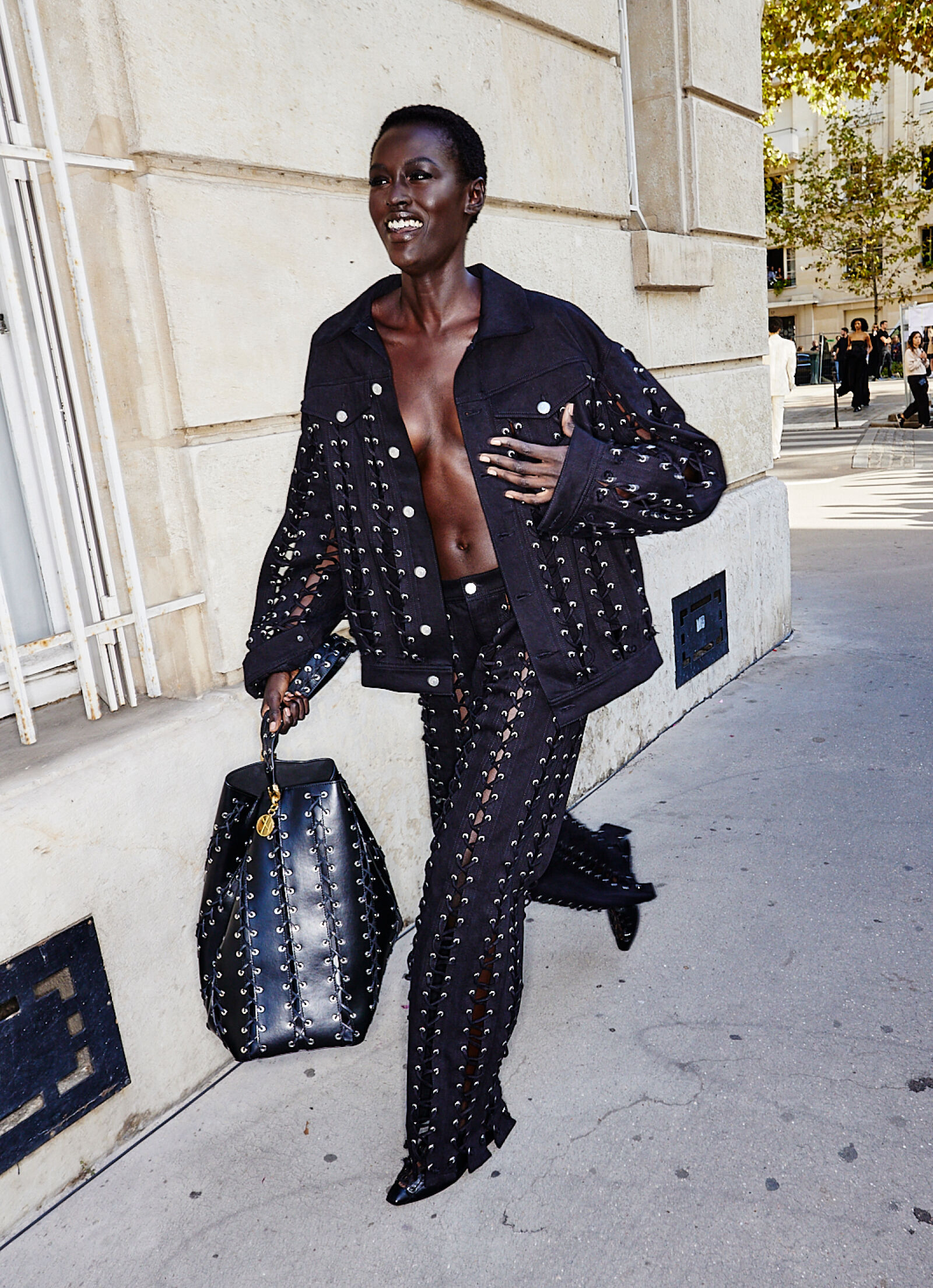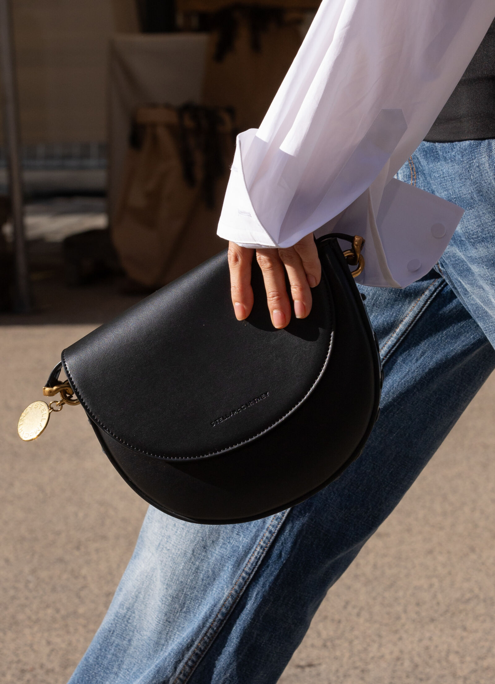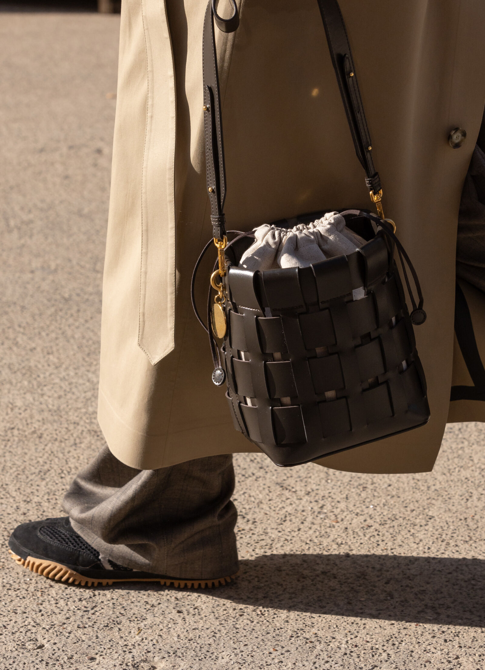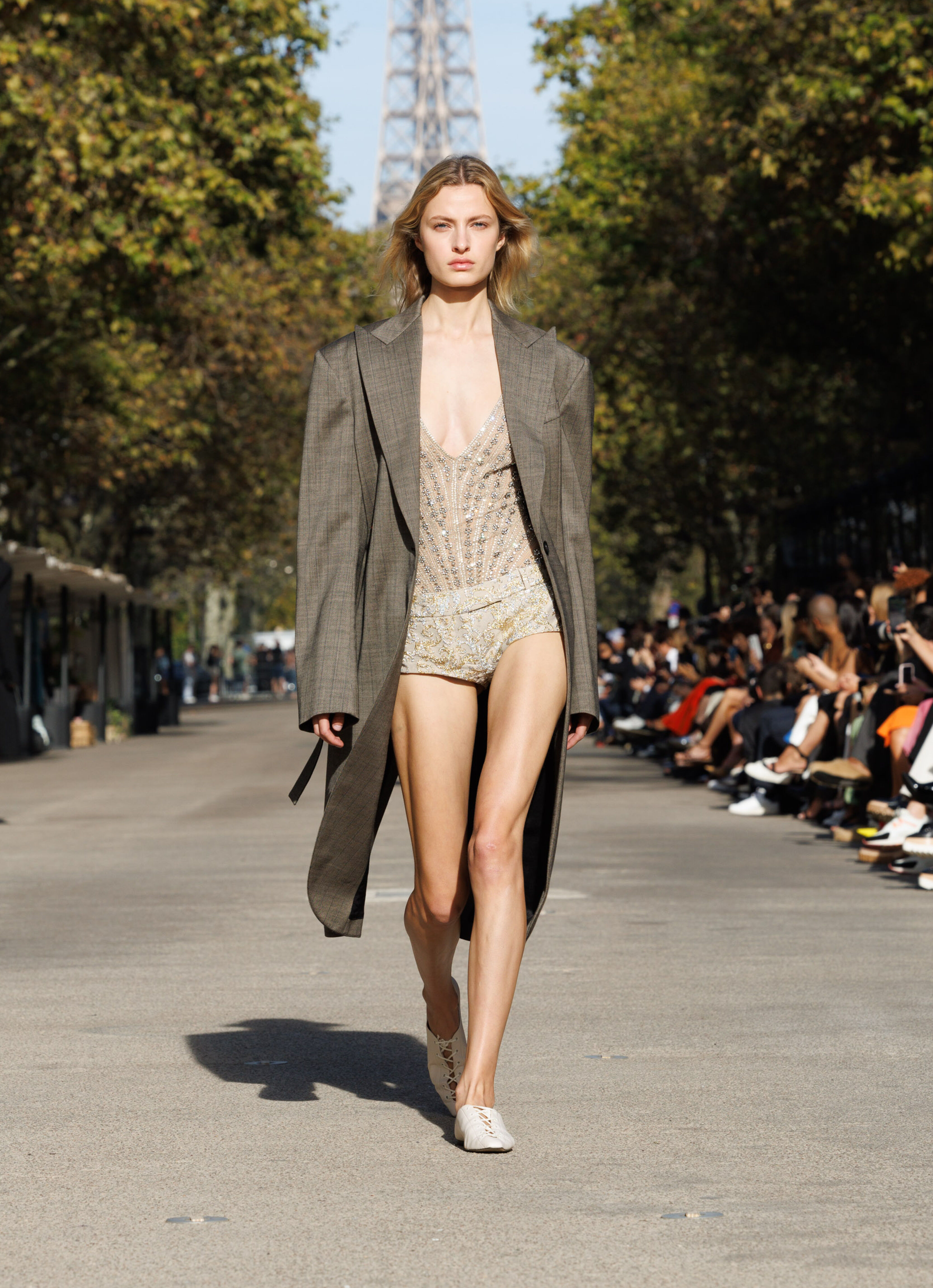 ランウェイショーでは、完全にトレーサブルな再生農法でブドウを栽培している、ヴーヴ・クリコ(Veuve Clicquot)のシャンパーニュのために収穫されたブドウの搾りかすから作られた、動物皮革に代わるヴィーガンレザーを使用した「フレイム(Frayme)」バッグも、レースと結び目をアクセントに登場。アイコニックな「ファラベラ(Falabella)」バッグは、ひねりを効かせたトライアングルシルエットにクリスタルをちりばめたスタイルで、「ミラム®」素材を使用したグレーカラーで再登場します。